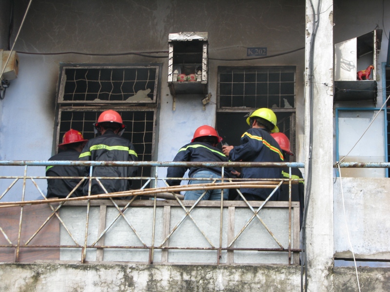 Tuy nhiên, do phòng 202 nằm ở tầng 2 của khu chung cư nên việc chữa cháy gặp nhiều khó khăn. Lực lượng chữa cháy phải dùng thang để tiếp cận hiện trường.