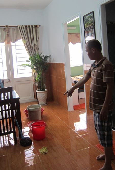 Anh Nguyễn Hải (39 tuổi, mua căn hộ 702) bức xúc: “Tôi mua và sử dụng căn hộ chung cư này từ tháng 12/2011, từ đó đến nay, việc nứt nẻ, thấm dột liên miên. Đợt mưa lớn mấy ngày trước, phòng tôi và phòng 703 nước dột chảy thành dòng, chúng tôi phải lấy xô, chậu để hứng. Khi ký hợp đồng mua nhà họ nói “ngon lành” lắm, bây giờ về ở mới biết”.