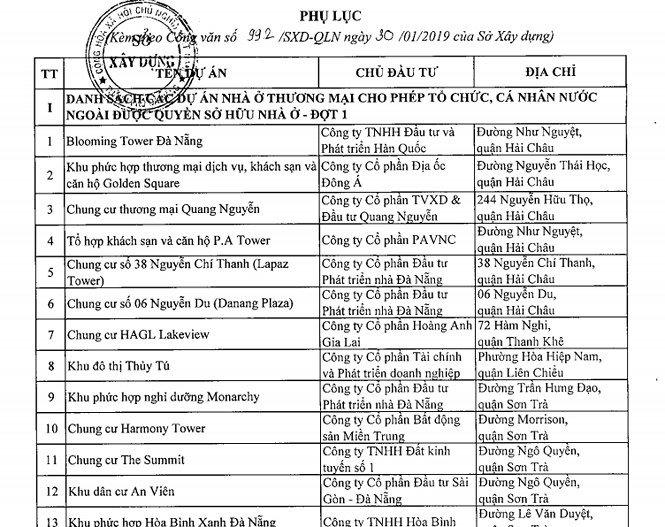 Sở Xây dựng Đà Nẵng còn cho biết, chưa xem xét việc tổ chức, cá nhân nước ngoài được sở hữu nhà ở tại các dự án nhà ở thương mại không nằm trong danh sách các dự án cho phép tổ chức, cá nhân nước ngoài được quyền sở hữu nhà ở nêu trên.