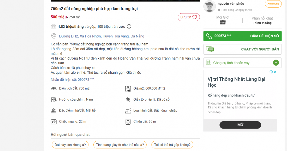 Hay trên trang chotot, một mảnh đất nông nghiệp có diện tích 750 m2 thuộc xã Hòa Nhơn, huyện Hòa Vang được rao với giá 500 triệu đồng, tương đương hơn 666.000 đồng/m2. Mảnh đất được giới thiệu là: "Đất đã có sổ đỏ. Lô đất ngang 22m dài 35m rất đẹp, mặt tiền đường bê-tông 4m, phía sau lô đất có khe nước rất mát mẻ". Chủ mảnh đất này còn cho biết thêm, giá có thể thương lượng thêm và chỉ cần trả trước 100 triệu đồng, sau đó trả góp mỗi tháng 1,83 triệu đồng.