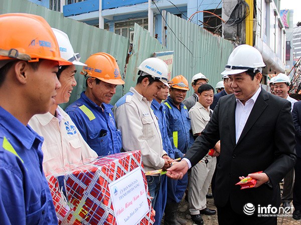 Chủ tịch UBND TP Đà Nẵng Huỳnh Đức Thơ tặng quà và lì xì đầu năm mới cho cán bộ, công nhân trên công trường thi công hầm chui nút giao thông phía Tây cầu sông Hàn (Ảnh: HC)