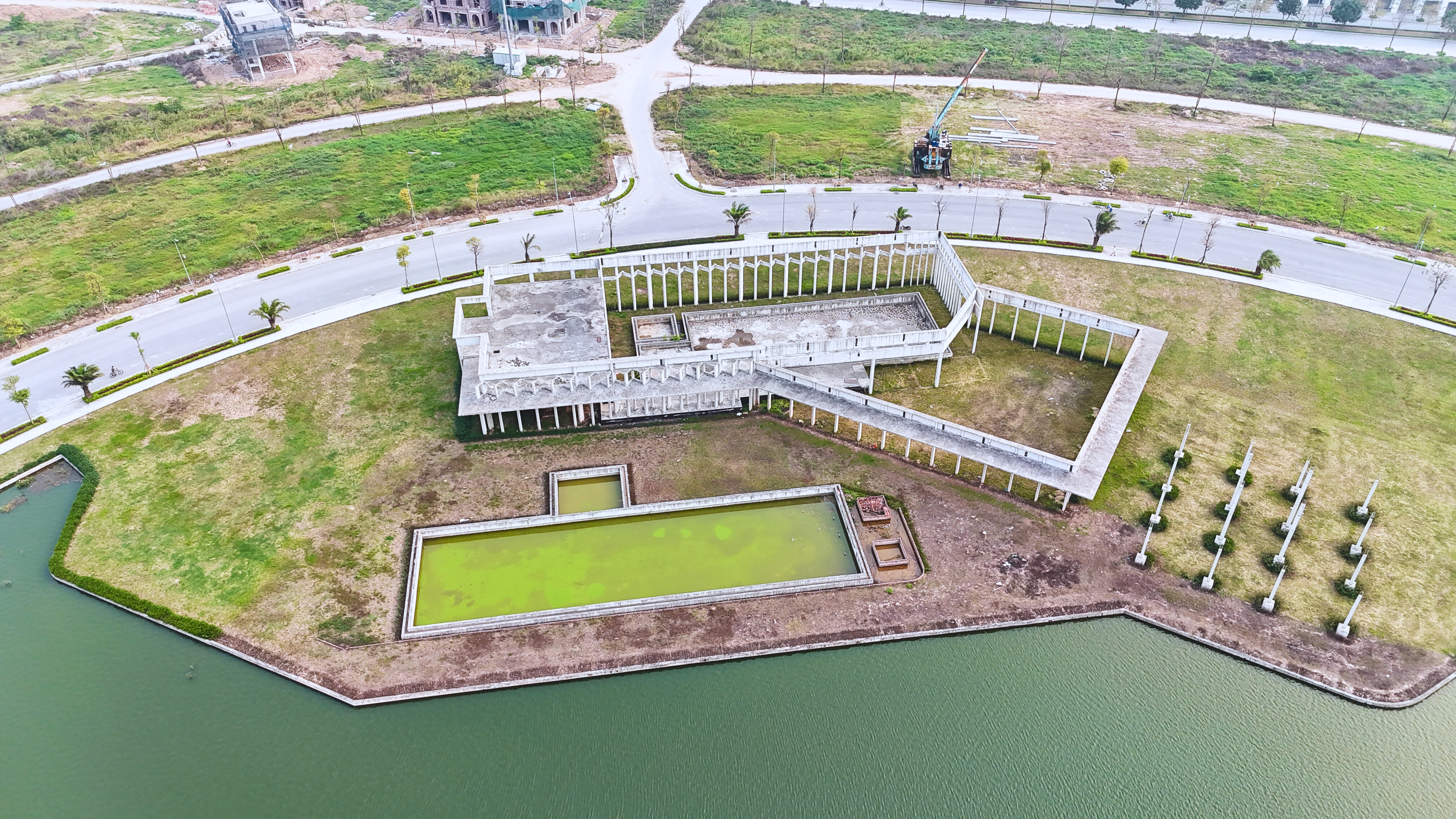 Tuy vậy, nhiều hạng mục vẫn dang dở: công viên trung tâm 6 ha và hồ điều hòa gần 20.000 m2 mới xong phần nền; các tiện ích như bản đồ thế giới, sân chơi, bể bơi còn nằm im trong những khối bê tông gỉ sét.