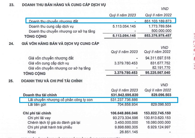 Doanh thu tài chính tăng trưởng mạnh từ 829 triệu đồng cùng kỳ năm trước lên đến gần 532 tỷ đồng. Theo thuyết minh, phần lớn đến từ lãi chuyển nhượng cổ phần công ty con, ghi nhận đạt tới hơn 531,2 tỷ đồng. Còn lại đến từ lãi tiền gửi hơn 704,8 triệu đồng.
