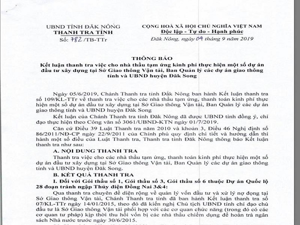 Thanh tra tỉnh Đắk Nông vừa có kết luận thanh tra về việc nhà thầu tạm ứng kinh phí thực hiện một số dự án đầu tư xây dựng tại Sở GTVT, Ban quản lý các dự án giao thông tỉnh và UBND huyện Đắk Song.