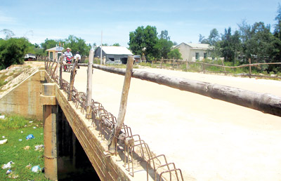 | Thành cầu làm tạm bợ bằng tre rất nguy hiểm đối với người đi đường. |