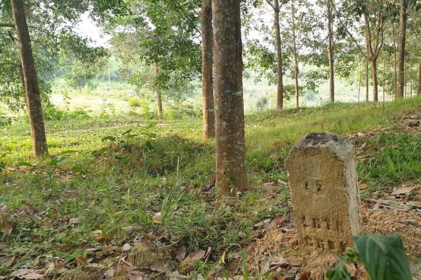 Tại trang trại xây dựng trên đất rừng của ông Thái, các mốc chỉ giới bảo vệ công trình thủy lợi hồ chứa nước Đá Mài - Tân Kim nằm rải rác ở diện tích đất trồng cây ăn quả, trồng cây caosu.