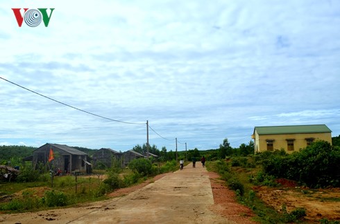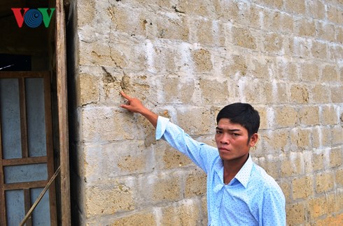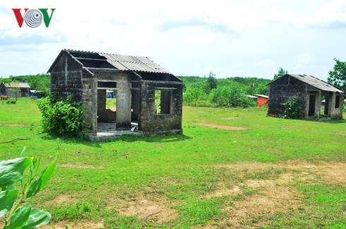 Với mức hỗ trợ 15 triệu đồng, gia đình chỉ đủ dựng một ngôi nhà tường không tô (trát), lợp bằng tấm fibro xi-măng. Nhà ở tạm bợ, mỗi lần mưa bão cả nhà nơm nớp lo sợ. Nơi đây lại thiếu nước sinh hoạt nên nhiều hộ bỏ về nơi ở cũ.
