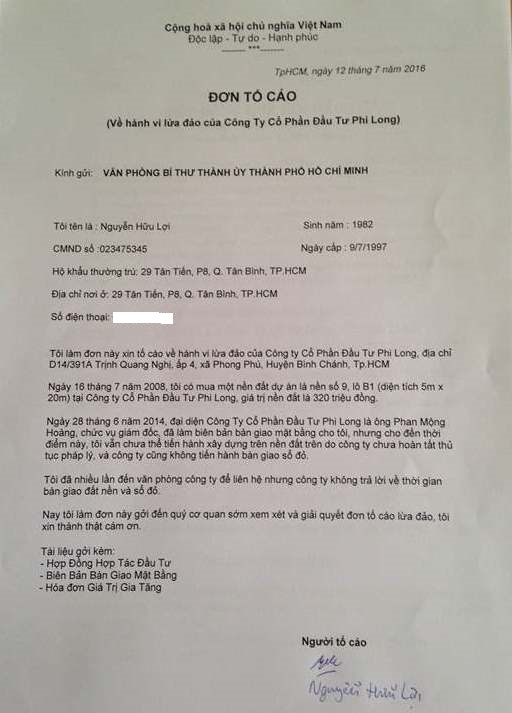 Anh Lợi và người thân đã nhiều lần trực tiếp liên hệ với Công ty Phi Long nhưng không được giải quyết. Quá bức xúc với thái độ của chủ đầu tư, ngày 12/7/2016 anh Lợi đã làm đơn gửi đến Văn phòng Bí thư thành ủy TP.HCM để tố cáo hành vi lừa đảo của Công ty Phi Long.