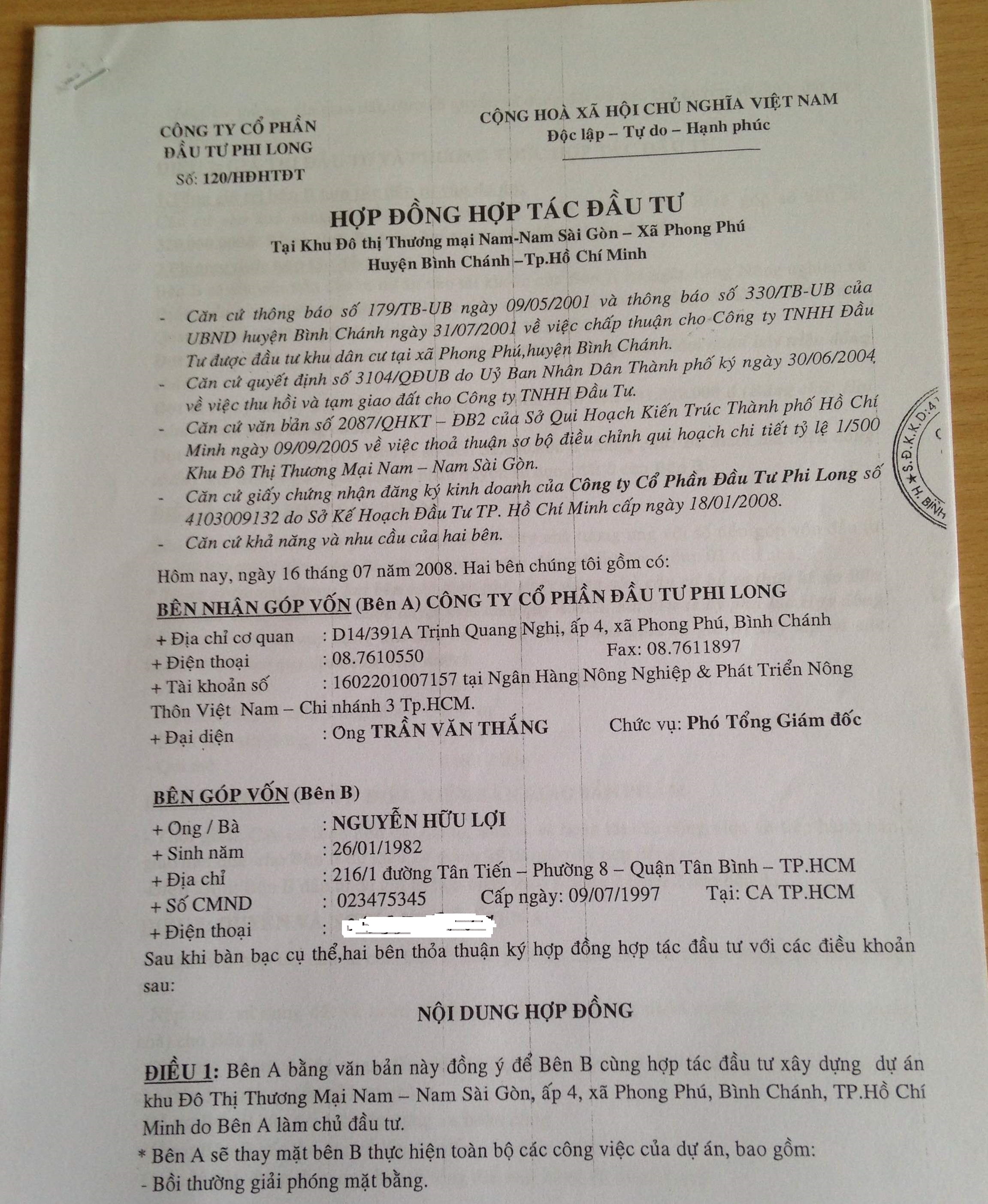 CafeLand nhận được phản ánh của anh Nguyễn Hữu Lợi (đường Tân Tiến, phường 8, quận Tân Bình) kêu cứu vì mua đất nền tại dự án của Công ty cổ phần đầu tư Phi Long (Công ty Phi Long) từ năm 2008 nhưng đến nay vẫn chưa có sổ đỏ cũng như không xây dựng được nhà trên khu đất mình đã mua. Anh Lợi cho biết, ngày 16/7/2008, anh ký hợp đồng hợp tác đầu tư tại dự án khu đô thị thương mại Nam – Nam Sài Gòn (xã Phong Phú, huyện Bình Chánh, TP.HCM) do Công Phi Long (D14/391A Trịnh Quang Nghị, xã Phong Phú, huyện Bình Chánh) làm chủ đầu tư. Người đại diện Công ty Phi Long ký hợp đồng với anh Lợi là ông Trần Văn Thắng, chức vụ Phó Tổng giám đốc. Để nhận được nền đất có diện tích 100m2 tại vị trí nền 9 thuộc lô B1 của dự án, anh Lợi phải đóng cho Công ty Phi Long số tiền 320 triệu đồng (chia làm 3 đợt).