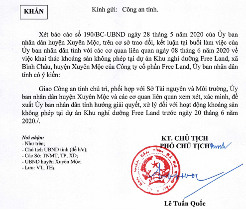 Theo đó, UBND tỉnh giao Công an tỉnh chủ trì, phối hợp với Sở Tài nguyên và Môi trường, UBND huyện Xuyên Mộc và các cơ quan liên quan xem xét, xác minh, đề xuất ủy ban nhân dân tỉnh hướng giải quyết, xử lý đối với hoạt động khoáng sản không phép tại dự án Khu nghỉ dưỡng Free Land trước ngày 20/6/2020.