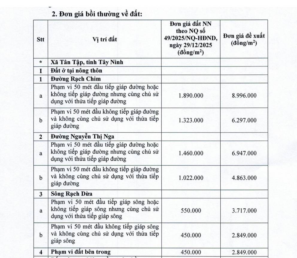 Đáng chú ý, trong phương án bồi thường, đơn giá đất được xây dựng chi tiết theo từng vị trí, tuyến đường và điều kiện tiếp giáp thực tế của từng thửa đất.