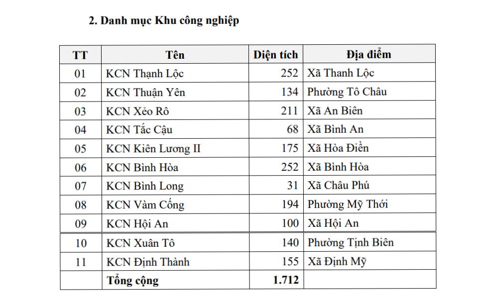 Các khu công nghiệp như Bình Long, Bình Hòa, Xuân Tô, Định Thành, Hội An, Vàm Cống sẽ gắn với trục Châu Đốc - Long Xuyên - Tân Châu - cửa khẩu Tịnh Biên. Trong khi đó, Thạnh Lộc, Xẻo Rô, Kiên Lương II, Thuận Yên định hướng phát triển gắn với cảng Hòn Chông, định hướng khu công nghiệp năng lượng - vật liệu xây dựng - chế biến xuất khẩu, phục vụ giao thương quốc tế qua cửa khẩu Hà Tiên