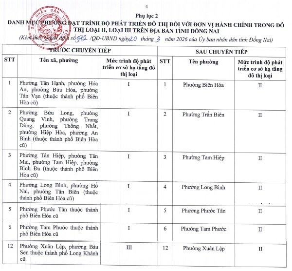 Đồng thời, danh mục phường đạt mức trình độ phát triển đô thị quy định đối với đơn vị hành chính trong đô thị loại II, III gồm 7 phường đạt mức loại II: Biên Hòa, Trấn Biên, Tam Hiệp, Long Bình, Phước Tân, Tam Phước và Xuân Lập (đạt mức trình độ phát triển cơ sở hạ tầng đô thị loại II).