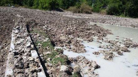 Bờ thành bằng bê tông của mương thủy lợi bị xe ủi xé nát, nằm vùi lấp trong bùn đất.