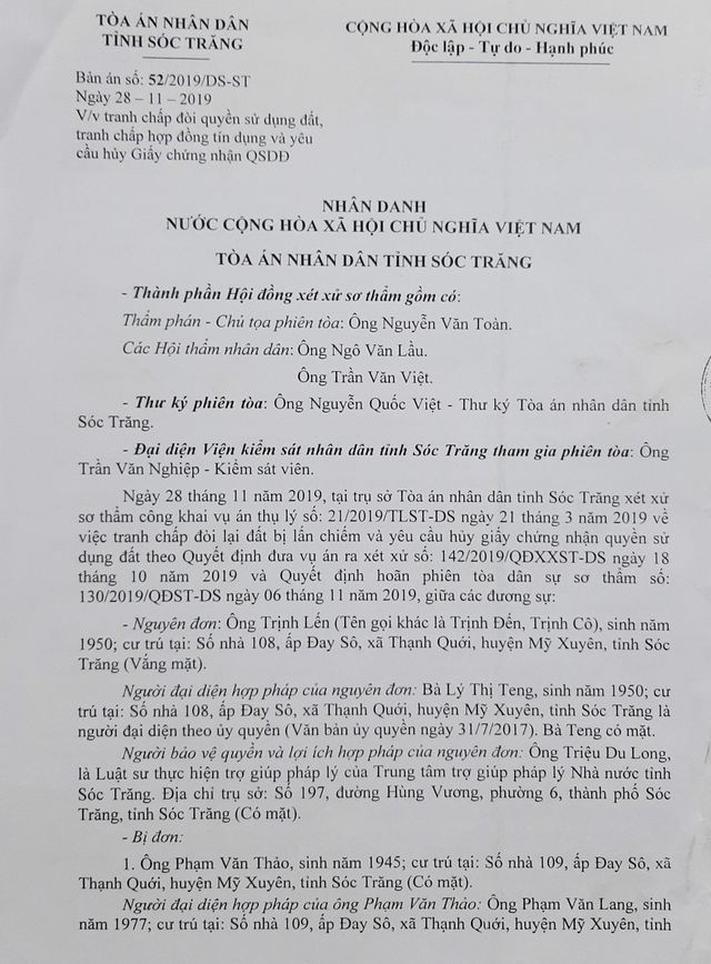 Ngày 28/11/2019, TAND tỉnh Sóc Trăng đưa vụ kiện ra xét xử sơ thẩm, tuyên buộc ông Thảo và các con có trách nhiệm liên đới trả cho ông Lến giá trị 2.618m2 đất, với số tiền hơn 548 triệu đồng; công nhận cho ông Thảo và các con được quyền tiếp tục sử dụng diện tích đất theo "sổ đỏ".