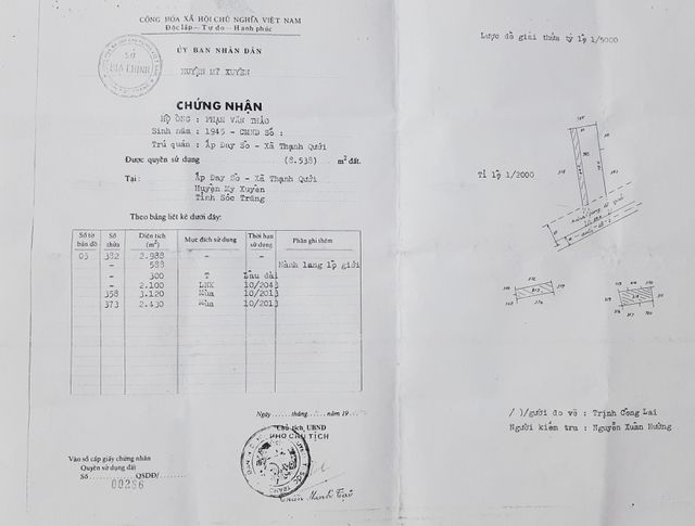 Ông Phạm Văn Thảo (SN 1945, ngụ xã Thạnh Quới, huyện Mỹ Xuyên, tỉnh Sóc Trăng) cho biết, năm 1976, cha ruột ông mua của ông Trịnh Cá (ngụ cùng địa phương) một phần đất diện tích 2.618m2, việc chuyển nhượng có làm giấy mua bán tay. Năm 1977, ông Thảo được cha ruột cho diện tích đất này và ông quản lý, sử dụng liên tục, không tranh chấp với ai. Đến ngày 10/4/2000, UBND huyện Mỹ Xuyên cấp “sổ đỏ” cho ông Thảo.