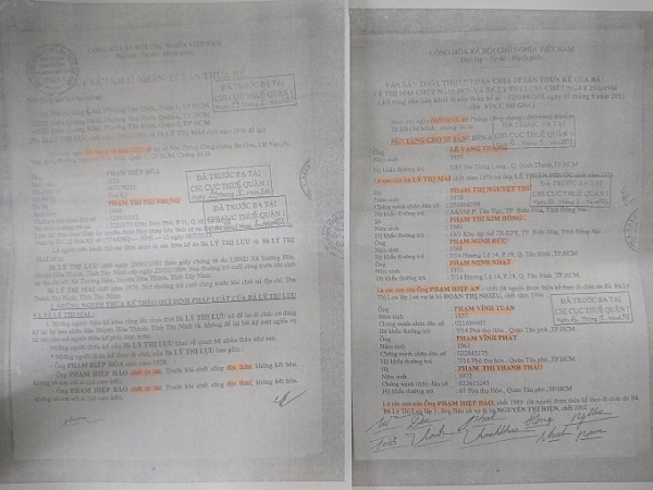 Đơn cử như: Văn bản khai nhận di sản ngày 08/8/2013, bà Phụng khai báo bất nhất, mâu thuẫn khi ghi các ông Bảo, Hảo, An đều đã chết từ lâu, trước khi chết độc thân, không kết hôn, không có con với ai. Nhưng, tại đơn đòi nhà và các giấy tờ do bà Phụng xuất trình lại có nêu một số người khác được bà Phụng cho rằng là người thừa kế di sản của bà Lựu.