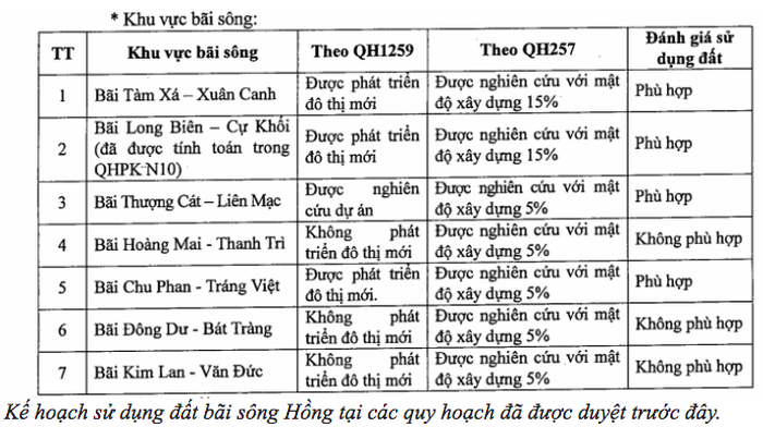 Diện tích bãi sông được nghiên cứu xây dựng với tỷ lệ 5% khoảng 1.590 ha theo Quy hoạch 257 gồm 5 bãi: Thượng Cát - Liên Mạc, Hoàng Mai - Thanh Trì, Chu Phan - Tráng Việt, Đông Dư - Bát Tràng, Kim Lan - Văn Đức. Diện tích bãi sông được phép xây dựng với tỷ lệ 15% khoảng 408 ha gồm bãi Tàm Xá - Xuân Canh. Các bãi sông này được định hướng xây dựng các khu đô thị mới hiện đại, các khu nhà ở sinh thái chất lượng cao và các công trình công cộng đô thị phục vụ cho cư dân hai bên sông và khu vực nội đô. Các công trình thiết kế chịu lũ với tầng 1 sử dụng đỗ xe, công cộng để giảm thiểu thiệt hại khi có lũ.