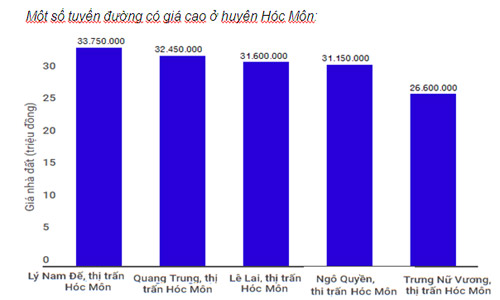 Tuyến phố có giá cao nhất vùng ven Bình Chánh là đường số 9, xã Bình Hưng, với 75 triệu đồng mỗi m2. Đường Nguyễn Hữu Thọ, xã Phước Kiển 36 triệu đồng mỗi m2, nằm trong top những tuyến đường có giá cao vùng ven huyện Nhà Bè. Những khu vực còn lại, vị trí đầu tiên thuộc về phố Lý Nam Đế, thị trấn Hóc Môn với giá 33,7 triệu đồng mỗi m2.