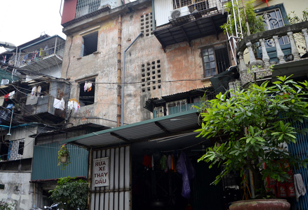Khu nhà anh Long đang xuống cấp khá nghiêm trọng. Từ bên ngoài, từng mảng rêu xanh ẩm mốc loang lổ, các ống nước và dây điện chằng chịt. Quần áo treo kín các ban công. Chuồng cọp cũng đua nhau xây dựng. Chính vì thế, trong nhà luôn luôn phải bật đèn.
