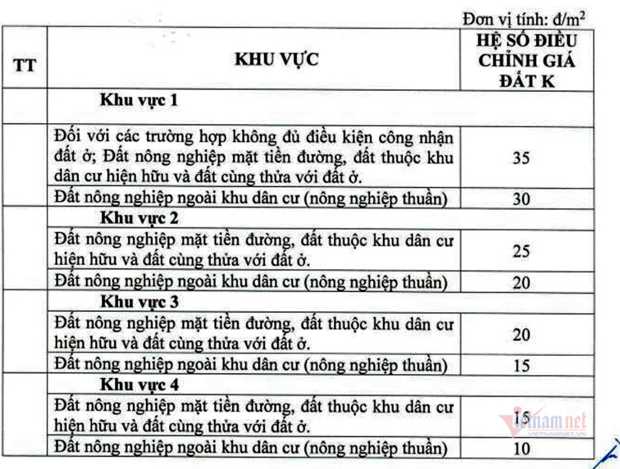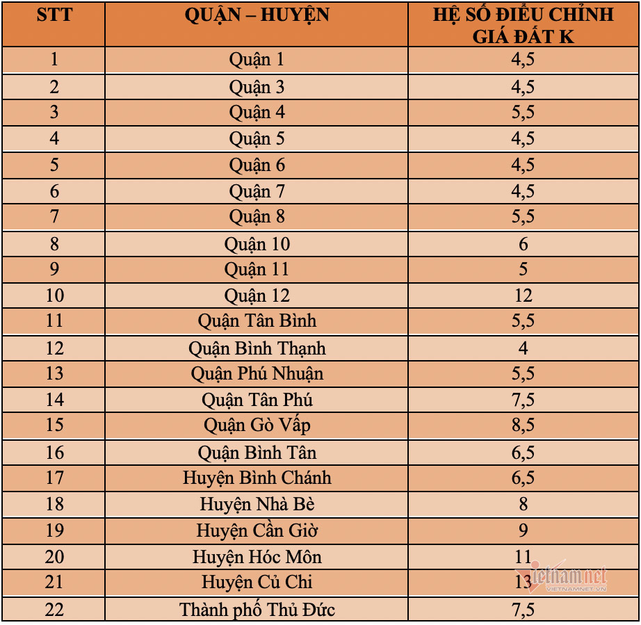 Hệ số điều chỉnh giá đất nông nghiệp cho từng khu vực tại TP.HCM.