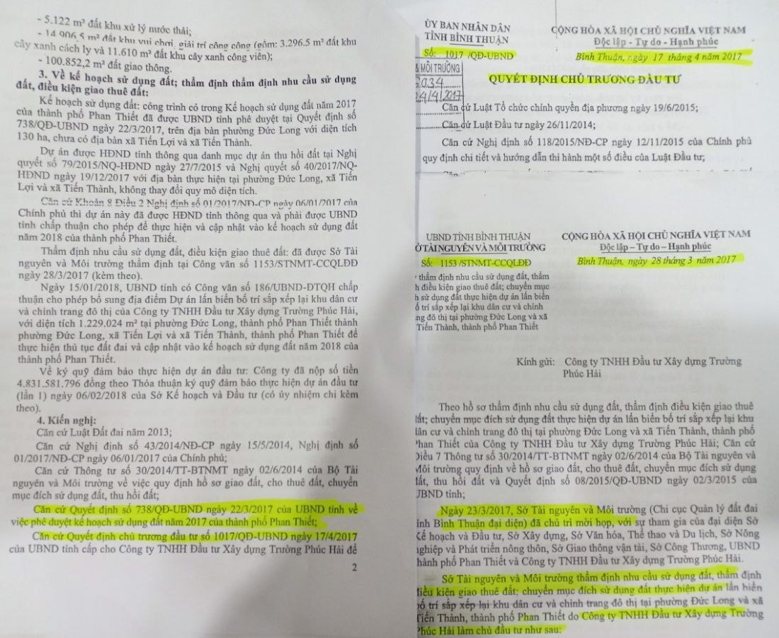 Ngày 28/3/2017, tức chỉ sau 5 ngày sau, Sở TN&MT tỉnh Bình Thuận có văn bản số 1153/STNMT-CCQLĐĐ gửi Công ty Trường Phúc Hải với nội dung: Theo hồ sơ thẩm định nhu cầu sử dụng đất, thẩm định điều kiện giao thuê đất, chuyển mục đích sử dụng đất thực hiện dự án lấn biển bố trí lại khu dân cư và chỉnh đô thị tại phường Đức Long và xã Tiến Thành, TP. Phan Thiết của Công ty Trường Phúc Hải. Và cũng tại văn bản này, Sở TN&MT thẩm định nhu cầu sử dụng đất, thẩm định điều kiện giao thuê đất, chuyển nhượng mục đích sử dụng đất thực hiện dự án lấn biển bố trí sắp xếp lại khu dân cư và chỉnh trang đô thị tại phường Đức Long và xã Tiến Thành, TP. Phan Thiết do công ty Trường Phúc Hải làm chủ đầu tư.