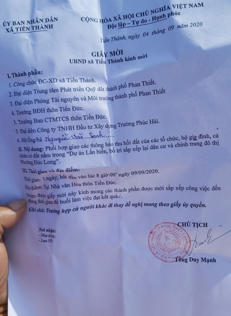 Ngày 9/9/2020, đại diện chính quyền tỉnh Bình Thuận mới chính thức tổ chức họp dân để để thực hiện thông báo thu hồi đất của các tổ chức, hộ gia đình, cá nhân có đất nằm trong dự án lấn biển