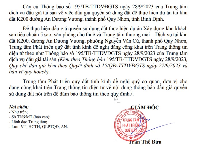 Trước đó vào tháng 6/2023, UBND tỉnh Bình Định vừa ban hành quyết định chấp thuận chủ trương đầu tư dự án Xây dựng khu khách sạn tiêu chuẩn 5 sao, văn phòng cho thuê và trung tâm thương mại - Dịch vụ tại khu đất K200, đường An Dương Vương, phường Nguyễn Văn Cừ, thành phố Quy Nhơn.