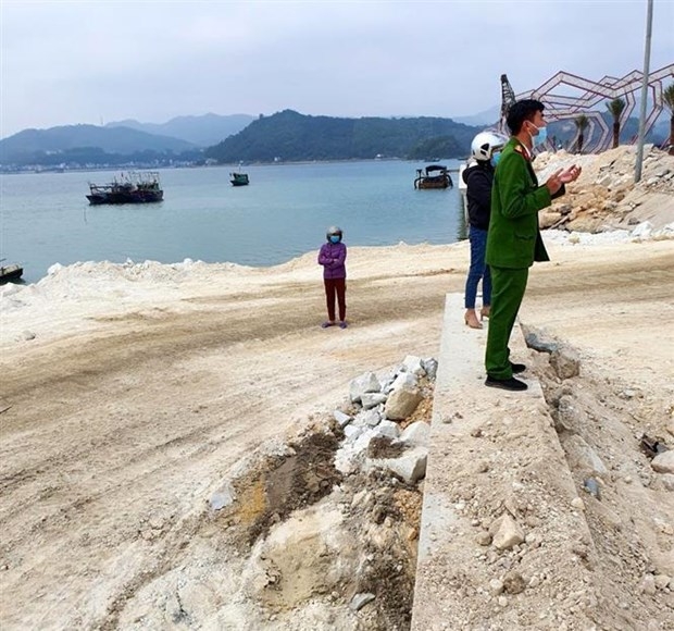 Lực lượng chức năng tại hiện trường khu vực nơi doanh nghiệp đổ trộm đất đá xuống vịnh Bái Tử Long. (Ảnh: TTXVN phát)