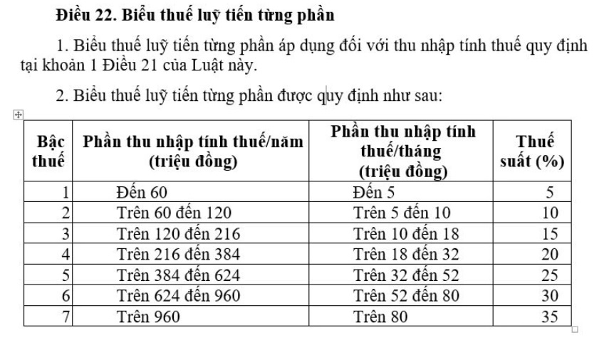 Khoản 2 Điều 22 Luật thuế TNCN quy định Biểu thuế lũy tiến từng phần áp dụng đối với thu nhập từ tiền lương, tiền công với 7 bậc thuế: 5%, 10%, 15%, 20%, 25%, 30% và 35%.