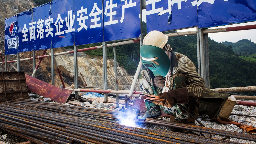 Một công nhân tại công trường xây dựng đập thủy điện Nậm Tha 1 đang được xây dựng bởi công ty Trung Quốc tại Lào. Nguồn: Getty Images
