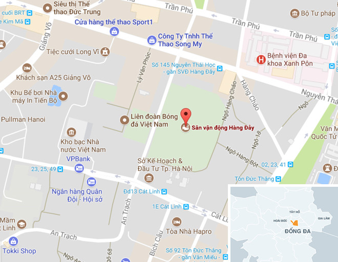 Sân vận động Hàng Đẫy (chấm đỏ) sẽ được mở rộng và có bãi đỗ xe ngầm. Ảnh: Google Maps.