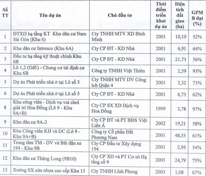 Do đó, tổ công tác liên ngành kiến nghị Thủ tướng chỉ đạo UBND TP.HCM xem xét, thu hồi 13 dự án trong KĐT phía nam đã được giao đất từ năm 1999 đến 2003 nhưng chưa hoàn thành giải phóng mặt bằng, chưa thực hiện nghĩa vụ tài chính đất đai, chưa đầu tư xây dựng.