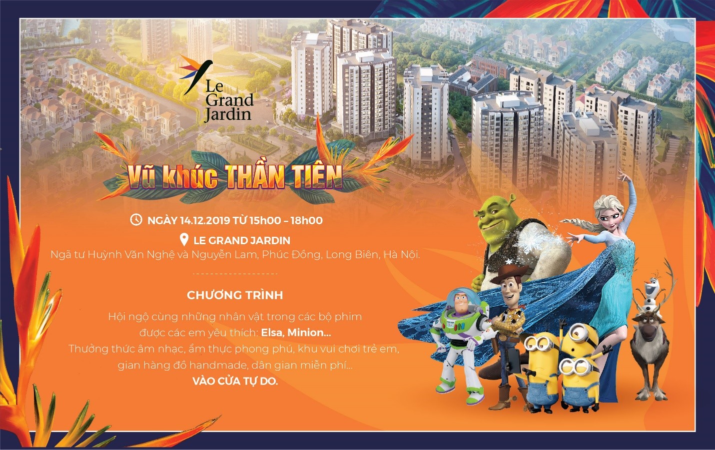 Chuỗi mini event lấy cảm hứng từ điệu nhảy tự do, sự phóng khoáng, tươi vui và hạnh phúc của hoa thiên điểu - loài hoa biểu tượng cho hình ảnh dự án. Hàng loạt các hoạt động được tổ chức xuyên suốt chuỗi mini event sẽ đem đến cho khách hàng tham dự những cảm xúc ấn tượng và cảm nhận chân thật nhất về cuộc sống thịnh vượng, dồi dào sức sống tươi trẻ, mang màu sắc hiện đại tại Le Grand Jardin.