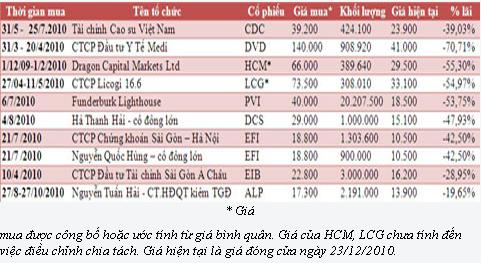 Tuy nhiên, không phải khoản đầu tư nào cũng đem lại lợi nhuận mơ ước như vậy, nhất là trong giai đoạn thị trường trầm lắng kéo dài. Danh sách những khoản lỗ lớn từ các thương vụ “thất bại” trong năm 2010 là khá dài.