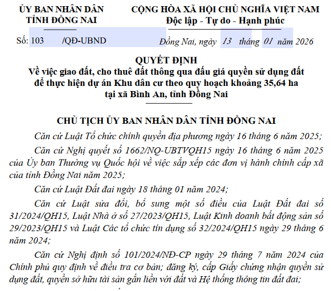 UBND tỉnh Đồng Nai vừa phê duyệt phương án đấu giá quyền sử dụng đất khu đất dự án trung tâm thương mại dịch vụ và dân cư theo quy hoạch tại xã Bình An, tỉnh Đồng Nai (xã Long Đức, huyện Long Thành cũ).