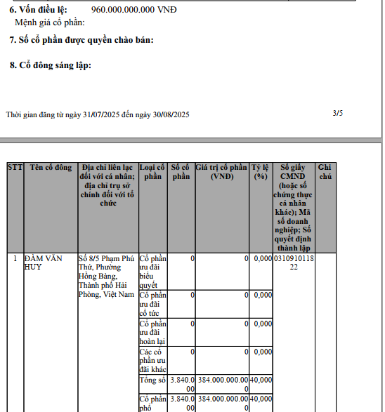 Vốn điều lệ 960 tỷ đồng trong đó ông Đàm Văn Huy góp 384 tỷ chiếm 40% vốn điều lệ; Ông Nguyễn Tiến Nhật góp 230,4 chiếm 24% vốn điều lệ; còn lai ông Đỗ Quốc Cường góp 345,6 tỷ chiếm 36% vốn điều lệ.
