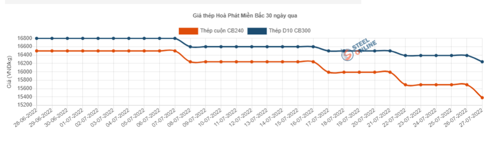 Cụ thể, Hòa Phát điều chỉnh giá thép tại miền Bắc với mức giảm lần lượt 300.000 đồng và 150.000 đồng một tấn đối với thép cuộn CB240 và thép thanh vằn D10 CB300. Sau điều chỉnh, giá bán 2 mặt hàng này giảm xuống còn 15,38 triệu đồng/tấn và 16,24 triệu đồng/tấn.