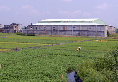| Nhà máy được xây dựng sát bên ruộng rau (Ảnh chụp tại quận Bình Tân TPHCM). Ảnh: Kim Ngân |