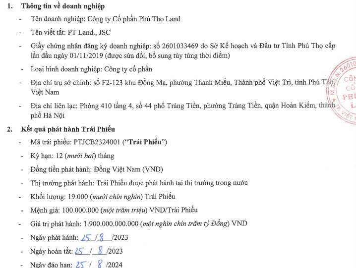 Ngày 8/8/2023, Phú Thọ Land vừa tăng vốn điều lệ từ 20 tỷ lên 1.750 tỷ đồng và cơ cấu cổ đông không được công bố. Người đại diện pháp luật cũng đổi từ ông Hoàng Ngọc Minh (sinh năm 1991) sang ông Nguyễn Danh Toàn (sinh năm 1970).