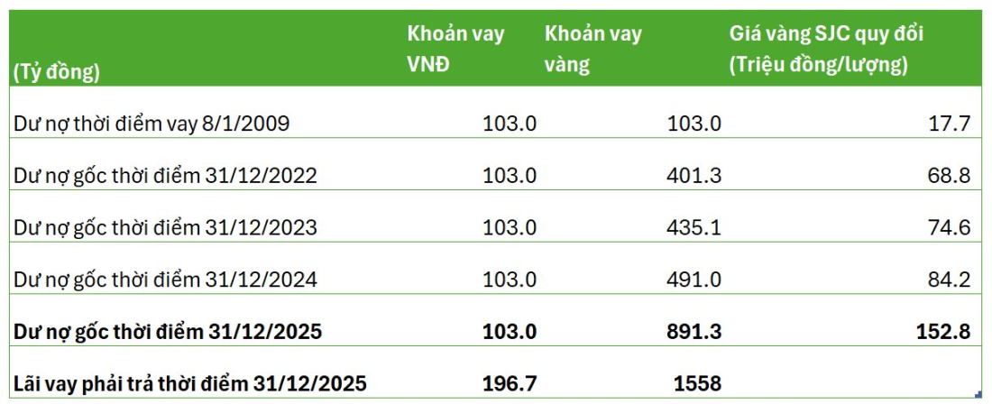 Tại thời điểm 31/12/2025, Công ty đã thực hiện đánh giá lại khoản nợ vay 5.833 lượng vàng SJC theo giá niêm yết của ngân hàng cho vay. Số dư nợ gốc của khoản vay vàng được quy đổi ở mức 891 tỷ đồng, tăng 500 tỷ so với năm trước, tương ứng giá vàng SJC quy đổi tăng từ 84,2 triệu lên 152,8 triệu đồng/lượng.
