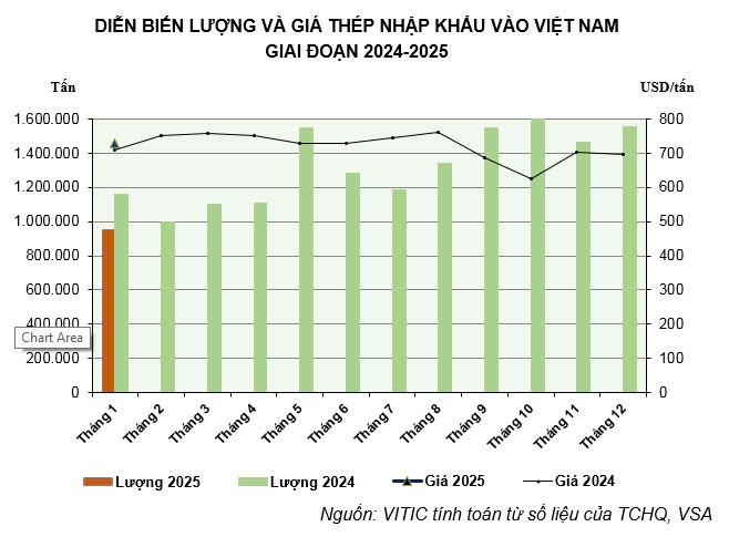 Trong tháng 1/2025, Việt Nam đã nhập khẩu khoảng 950.000 tấn thép các loại