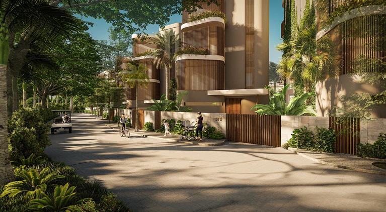 Chuỗi biệt thự lấy ngôn ngữ kiến trúc tropical làm trọng tâm với điểm nhấn là sử dụng chất liệu thuần Á Đông như tre, gỗ, nứa… Nơi đây vắng bóng những dãy phố bê tông nóng bỏng, thay vào đó là cung đường, vỉa hè được lát đá núi, với những khe hở cho mưa thấm xuống đất, thảm thực vật vẫn tự do sinh trưởng, góp phần kiến tạo nên một không gian sống xanh đa tầng đa lớp.