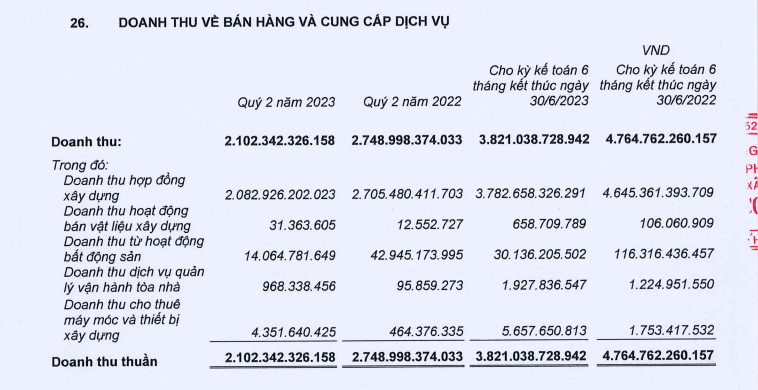 Trong quý 2, Ricons ghi nhận doanh thu thuần đạt 2.102 tỷ đồng, giảm 24% so với cùng kỳ. Trong cơ cấu doanh thu, chiếm đa số là doanh thu đến từ hợp đồng xây dựng với gần 2.083 tỷ đồng, chiếm 99%; doanh thu từ hoạt động bất động sản là 14 tỷ đồng; còn lại đến từ doanh thu khác.