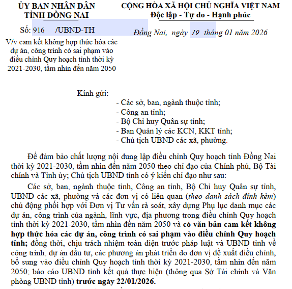 Hạn chót được ấn định rõ ràng: trước ngày 22/1/2026. Sau thời điểm này, đơn vị nào không có văn bản cam kết sẽ bị loại thẳng danh mục dự án khỏi hồ sơ điều chỉnh quy hoạch.