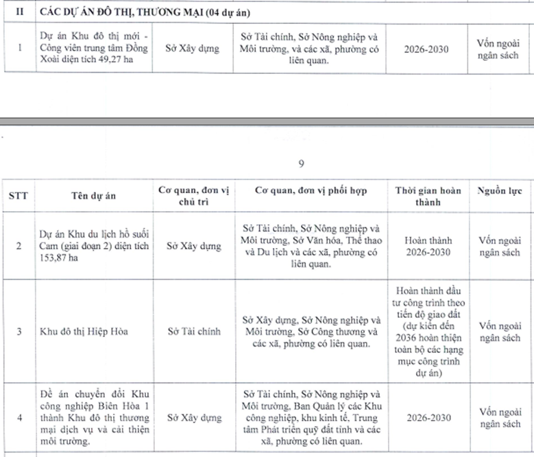 Theo danh mục, nhóm các dự án đô thị, thương mại và dịch vụ ngoài ngân sách được phân loại có 4 dự án có quy mô lớn, định hình không gian đô thị trung – đại của Đồng Nai: