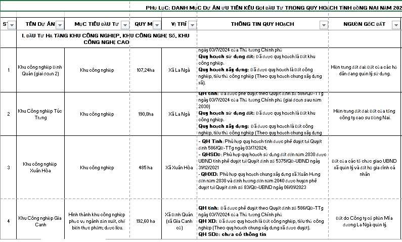 Các dự án đã được rà soát kỹ lưỡng về quy hoạch tỉnh, quy hoạch sử dụng đất, quy hoạch xây dựng và nguồn gốc đất, đảm bảo phù hợp với Quy hoạch tỉnh Đồng Nai thời kỳ 2021–2030, tầm nhìn 2050 đã được Thủ tướng phê duyệt tại Quyết định số 586/QĐ-TTg ngày 03/7/2024.