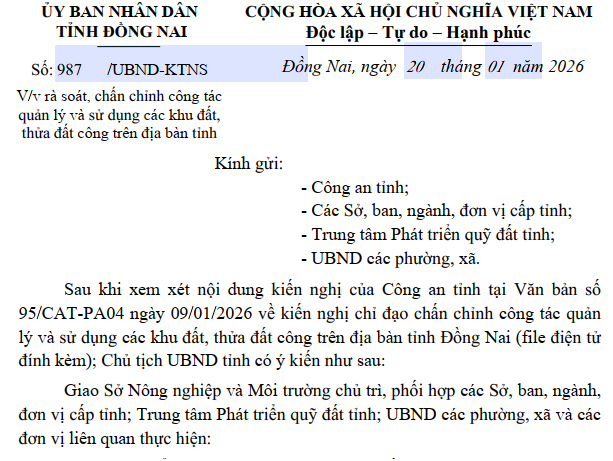 Theo UBND tỉnh Đồng Nai, chỉ đạo này được ban hành sau khi xem xét kiến nghị của Công an tỉnh Đồng Nai tại Văn bản số 95/CAT-PA04 ngày 9/1/2026 về việc chấn chỉnh công tác quản lý, sử dụng đất công trên địa bàn tỉnh.