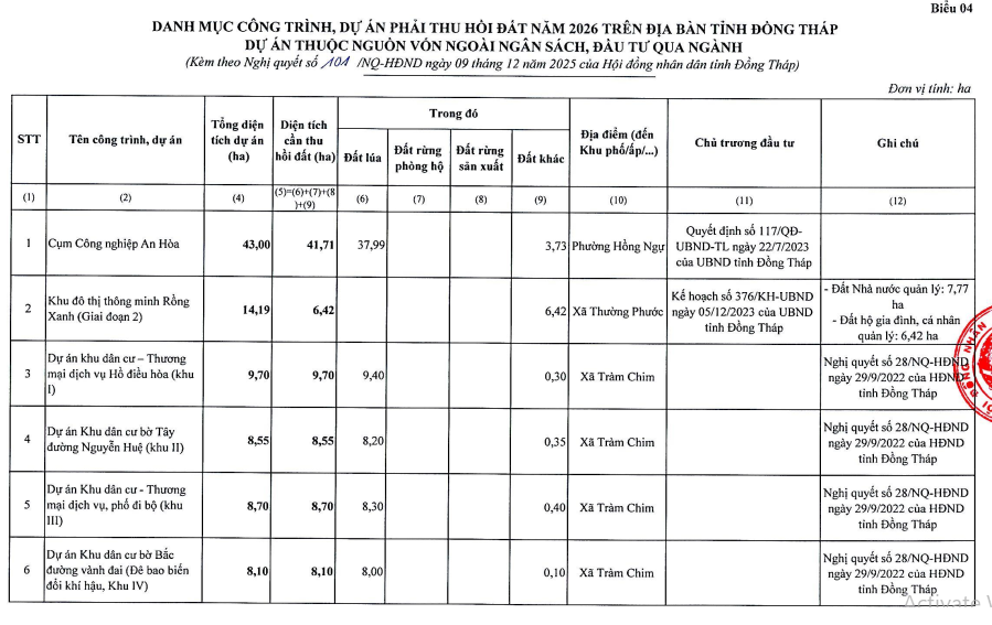 Theo danh mục sử dụng nguồn vốn ngoài ngân sách, có 3 CCN chính yêu cầu thu hồi đất, với tổng diện tích thu hồi khoảng 139,9 ha. Những dự án này tập trung vào việc tạo quỹ đất sạch để thu hút đầu tư tư nhân, phù hợp với Quy hoạch tỉnh Đồng Tháp thời kỳ 2021-2030.