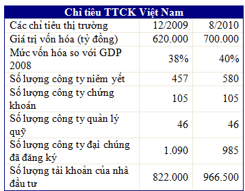 Với các chính sách điều chỉnh hợp lý từ Chính phủ và các cơ quan hữu quan, TTCK Việt Nam được giữ vững, dần đi vào ổn định và từng bước phát triển phù hợp với sự ổn định kinh tế vĩ mô. Các chỉ tiêu TTCK phản ánh mức tăng trưởng hợp lý với diễn biến nền kinh tế Việt Nam và gắn liền với sự tăng trưởng của thị trường vốn quốc tế. Cụ thể, số lượng công ty niêm yết tăng khá nhanh, đưa tổng số cổ phiếu niêm yết trên 2 SGDCK là 580 công ty (năm 2008 là 338 công ty), với tổng mức vốn hóa thị trường cổ phiếu đạt 40% GDP. Hoạt động của doanh nghiệp niêm yết có mức tăng trưởng tốt trong năm 2009 và đầu năm 2010, nếu như trong năm 2008 có trên 80% doanh nghiệp niêm yết thua lỗ, thì trong năm 2009 các doanh nghiệp đều có lãi và có mức tăng trưởng vượt kế hoạch chỉ tiêu doanh thu, lợi nhuận. Mặc dù gặp nhiều khó khăn, nhưng tổng mức vốn huy động của doanh nghiệp qua TTCK trong năm 2009 đạt 33 nghìn tỷ đồng (mức huy động vốn trong năm 2008 là 29 nghìn tỷ đồng).